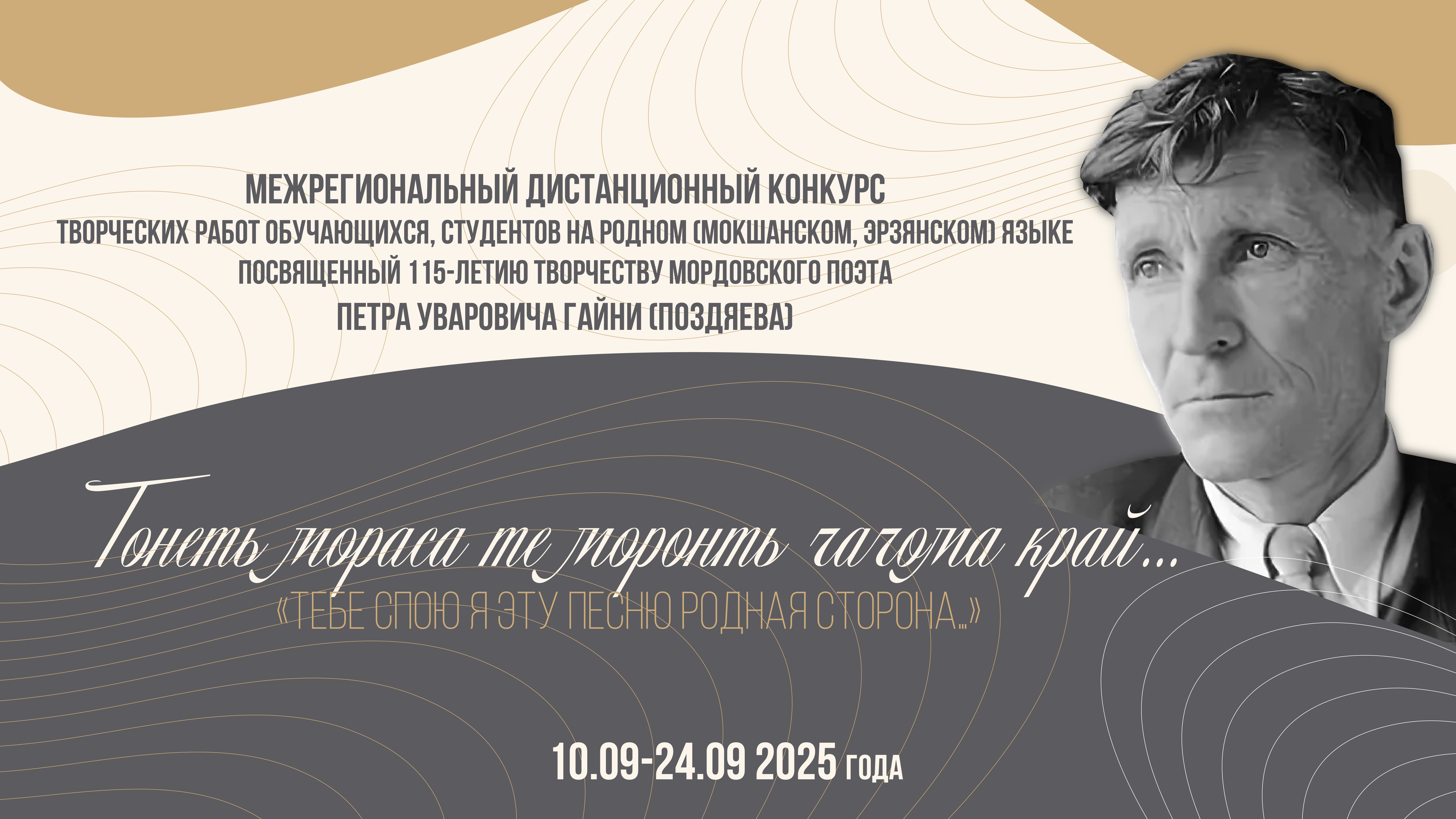 10 сентября 2025 года стартовал межрегиональный дистанционный конкурс творческих работ обучающихся, студентов на родном (мокшанском, эрзянском) языке «Тонеть мораса те моронть чачома край…» («Тебе спою я эту песню родная сторона…»), посвященный 115-летию творчеству мордовского поэта Петра Уваровича Гайни (Поздяева).