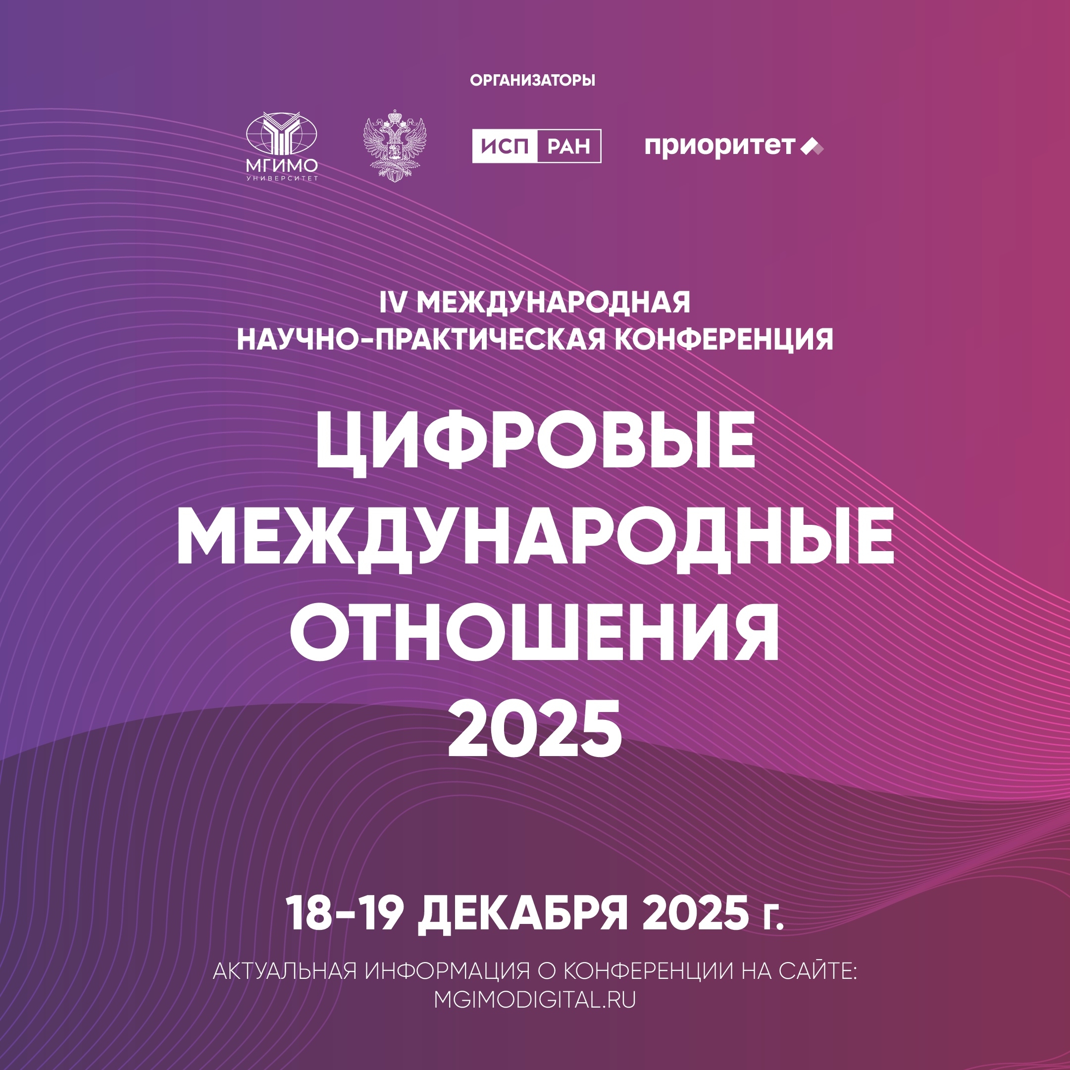 В рамках реализации программы стратегического академического лидерства «Приоритет 2030» МГИМО МИД России под руководством Министерства иностранных дел Российской Федерации во взаимодействии с Институтом системного программирования им. В.П. Иванникова РАН 18-19 декабря 2025 г. проводит IV международную научно-практическую конференцию «Цифровые международные отношения 2025: Человек в фокусе цифрового развития».