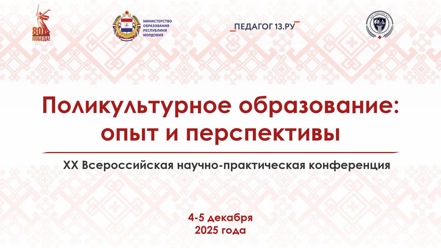 4 декабря 2025 года на площадке Республиканского межшкольного центра национальных культур (МОУ «Гимназия № 19» г. о. Саранск) в рамках реализации государственной программы «Сохранение и развитие национальной культуры, государственных языков Республики Мордовия и других языков в Республике Мордовия» на 2022–2026 гг. проведено пленарное заседание ХХ Всероссийской научно-практической конференции педагогов «Поликультурное образование: опыт и перспективы», посвященная реализации национальной программы «Десятилетие детства 2018–2027 гг.