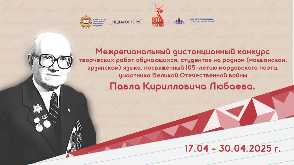 Центр непрерывного повышения профессионального мастерства педагогических работников «Педагог 13.ру» в рамках государственной программы «Сохранение и развитие национальной культуры, государственных языков Республики Мордовия и других языков в Республике Мордовия» провёл с 17 апреля по 30 апреля 2025 года межрегиональный дистанционный конкурс творческих работ обучающихся, студентов на родном (мокшанском, эрзянском) языке, посвященный 105-летию мордовского поэта, участника Великой Отечественной войны Павла Кирилловича Любаева. В конкурсе приянили участие обучающиеся 1 –11 классов общеобразовательных организаций, студентов вузов и СПО, воспитанников ДОУ, воспитателей, реализующих программы этнокультурной направленности Республики Мордовия и регионов Российской Федерации.