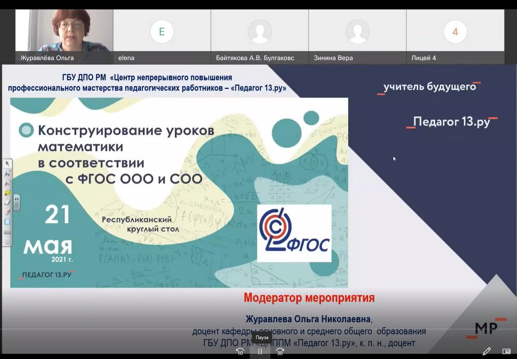 21 мая 2021 года в режиме онлайн на базе Центра непрерывного повышения профессионального мастерства педагогических работников «Педагог 13.ру» состоялся Республиканский круглый стол «Конструирование уроков математики в соответствии с ФГОС ООО и СОО».