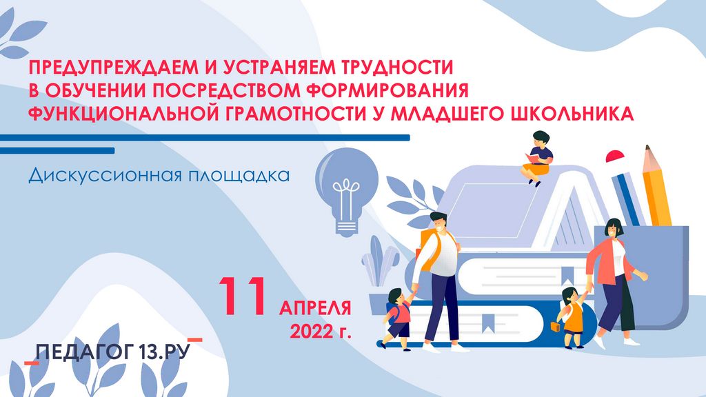 11 апреля 2022 года лабораторией начального общего образования, действующей на кафедре дошкольного и начального образования ЦНППМ «Педагог 13.ру», организована дискуссионная площадка «Предупреждаем и устраняем трудности в обучении посредством формирования функциональной грамотности у младших школьников».