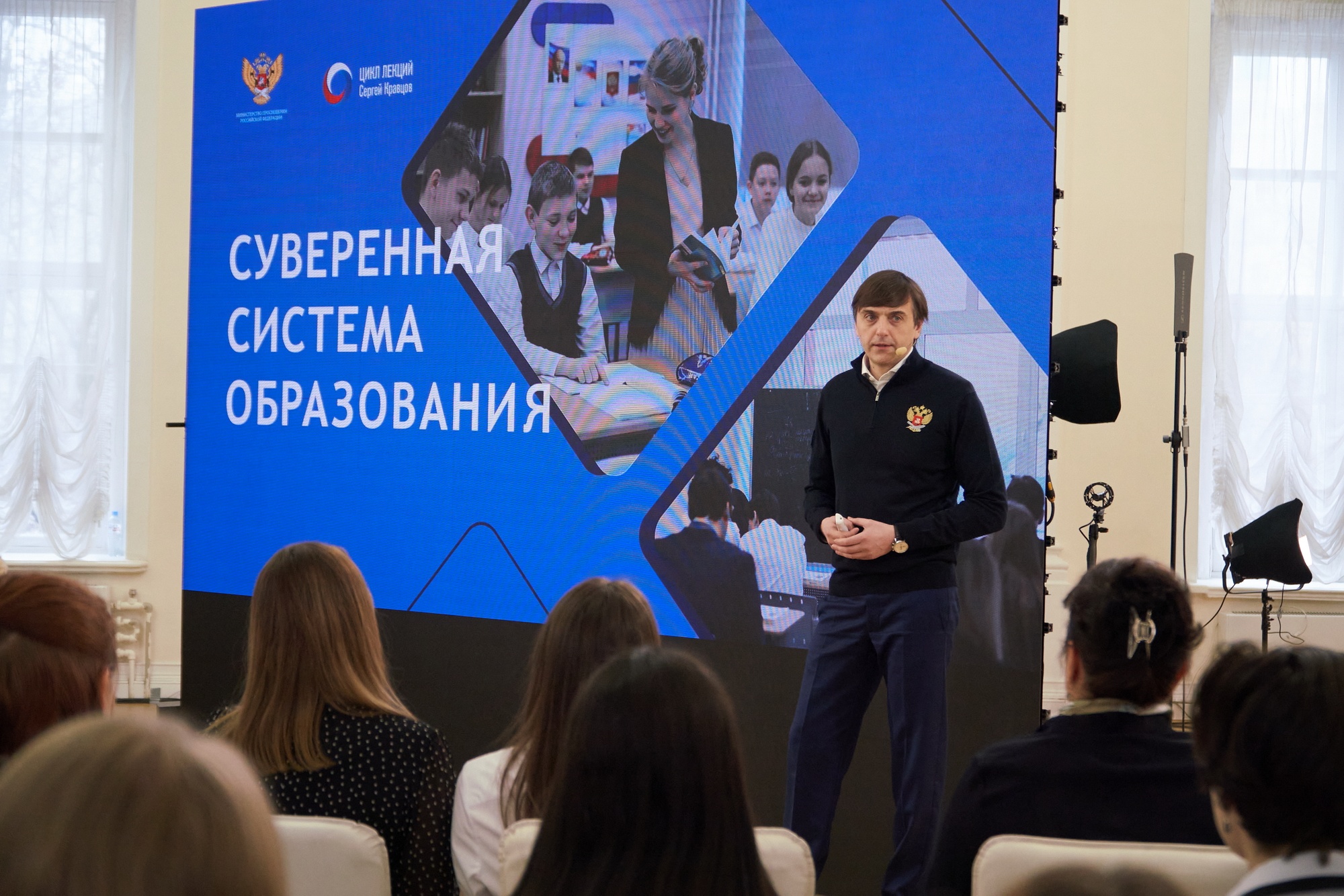 Сергей Кравцов: Спасибо. Ну, честно говоря, я давно не читал лекции, вот сейчас решил как-то. Хотя преподавал в педагогическом университете, который заканчивал, когда учился в аспирантуре. Сегодня такая хорошая атмосфера, я хочу всех поблагодарить. Если есть такая востребованность, то конечно. Потому что, на мой взгляд, очень важно доносить и до студентов педагогических вузов и педагогических колледжей, и до директоров школ, и работников системы повышения квалификации те задачи, которые мы решаем, тот вектор развития. Потому что мы должны работать едино. Когда у нас есть разорванность, от этого страдают система образования и в конечном счете наши дети. Поэтому будем дальше продолжать.