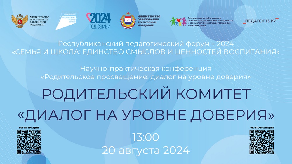 20 августа 2024 года в 13.00 в рамках Республиканского педагогического форума – 2024 «Семья и школа: единство смыслов и ценностей воспитания» Региональная служба консультирования родителей на базе ЦНППМ «Педагог 13.ру» проводит родительский комитет «Диалог на уровне доверия».