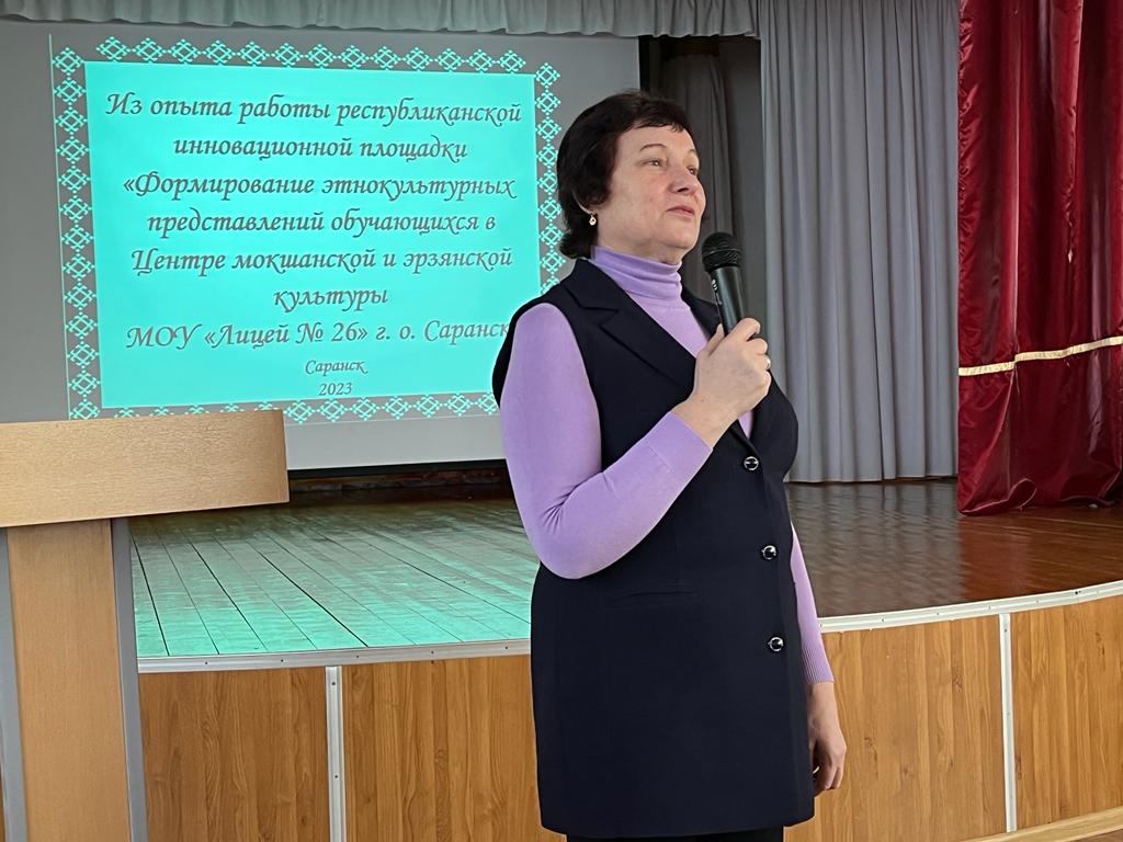 Зубарева И. Г., директор Центра эрзянской и мокшанской культуры МОУ «Лицей № 26» г.о. Саранск, канд. пед. наук, учитель эрзянского языка, представила опыт работы республиканской инновационной площадки «Формирование этнокультурных представлений обучающихся общеобразовательной организации».