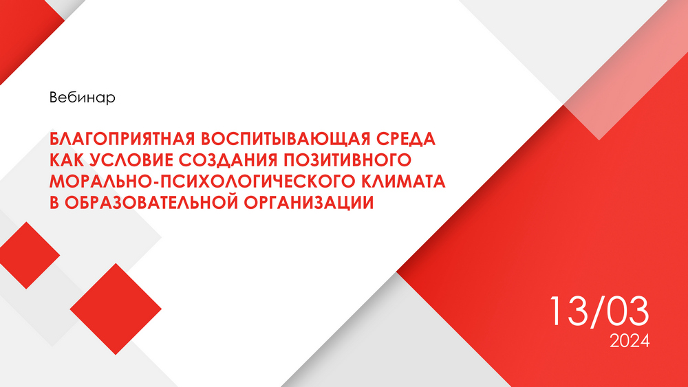 13 марта 2024 года на площадке ГБУ ДПО РМ «ЦНППМ «Педагог 13.ру» состоялся вебинар, посвященный вопросам влияния воспитывающей среды на создание позитивного морально-психологического климата в образовательной организации. Вебинар прошел в рамках исполнения поручения Министерства образования Республики Мордовия по реализации Порядка проведения предварительного, текущего и итогового контроля за состоянием морально-психологического климата обучающихся общеобразовательных и профессиональных образовательных организаций Республики Мордовия.