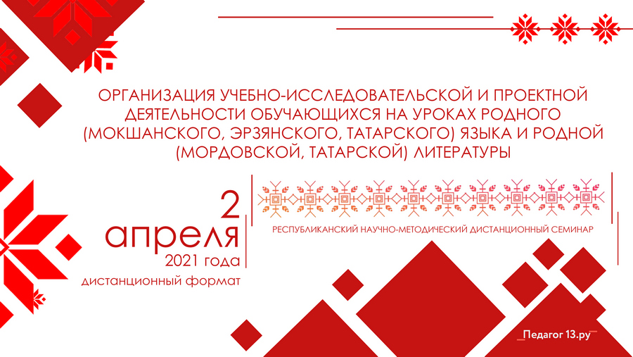 ГБУ ДПО РМ «Центр непрерывного повышения профессионального мастерства педагогических работников – «Педагог 13.ру» совместно с МОУ «Лицей № 26» г.о. Саранск в рамках реализации инновационной площадки по теме: «Формирование этнокультурных представлений обучающихся (на примере Центра мокшанской и эрзянской культуры МОУ Лицей № 26» г.о. Саранск)» приглашает 2 апреля 2021 года принять участие в работе Республиканского научно-методического дистанционного семинара по теме: «Организация учебно-исследовательской и проектной деятельности обучающихся на уроках родного (мокшанского, эрзянского, татарского) языка и родной (мордовской, татарской) литературы».